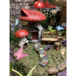 The Fiddlehead Log Fairy House is designed to blend in seamlessly to a human garden, especially one with woodland- it’s the perfect fairy house for a secretive or shy fairy. The entrance is hidden under an overhanging bark end and the windows in the side also have bark overhangs, so from certain angles it looks just like a fallen log. Inside it’s one large room, accessed by an opening door directly from the outside, with decent sized windows adding light midway down. There’s a chimney for a stove or similar already fitted.