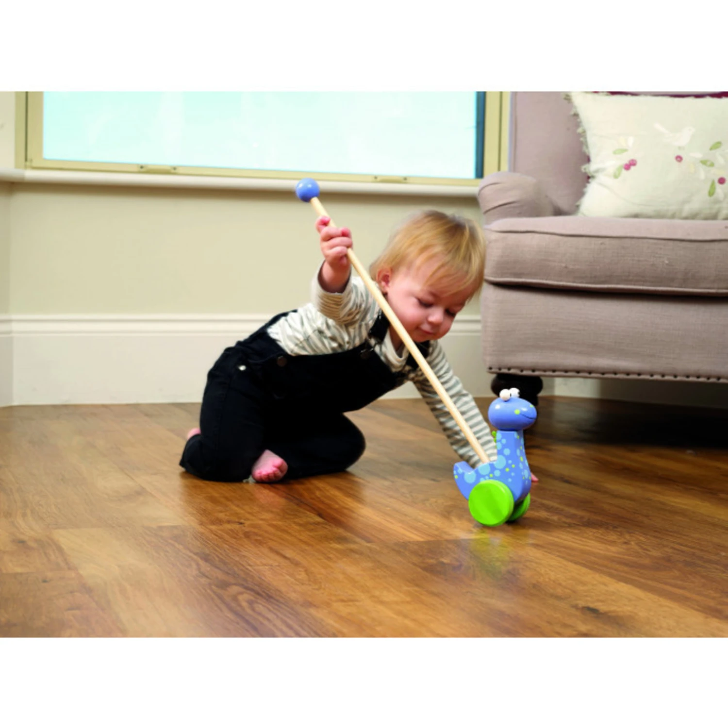 This cute Diplodocus wooden push along is is the perfect traditional toy for toddlers. Painted in a gorgeous, colourful design that will have your little one toddling along in no time.