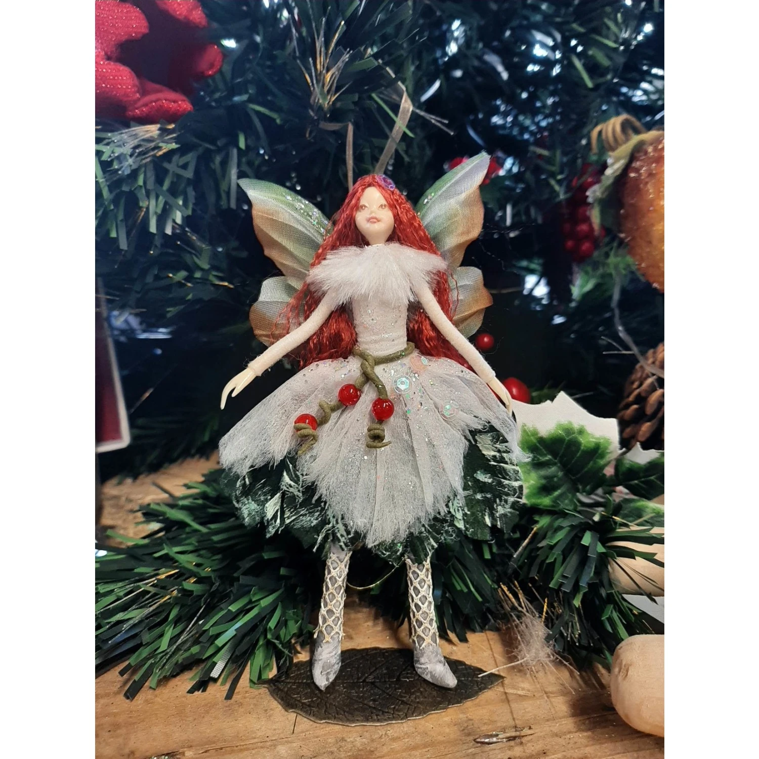 Noelle has red hair, a white and dark green knee length dress adorned with ‘red berries’, her wings are a mix of orange, white and green.
