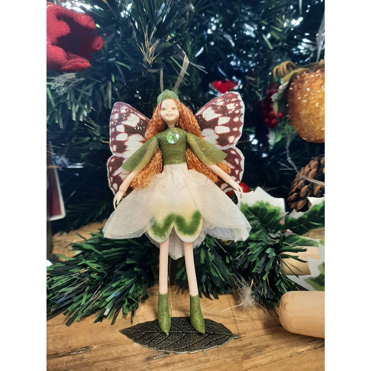Snowdrop looks like her namesake, her bodice, hat and boots are a light green, the skirt is white and shaped like the flowers petals. Her hair is ginger and her wings are brown and white, looking like a butterfly.